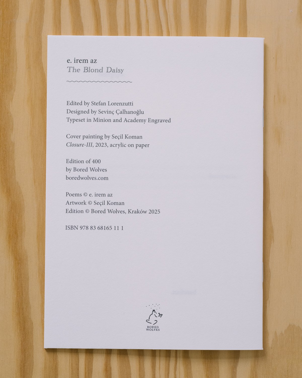 e. irem az’ The Blond Daisy is a booklet composed of two multi-section poems, including the eponymous poem, about irem’s late grandmother, Zinet Tosun, and her Allah, at once universally boundless and simultaneously present in diurnal labor; and “perhaps it all started with,” which resurfaces smothering intergenerational trauma, zeroing in on domestic thresholds as simultaneously a seal but also potential escape route.